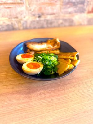 Additional Pork Chashu, Marinated 1/2 Cut Egg, Bamboo Shoot and spring onions.