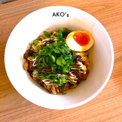 Juicy Shredded Pork Belly Chashu, Amadare Sweet Sauce, Japanese Mayo, Spring Onion, Marinated 1/2 cut egg on Japanese white rice