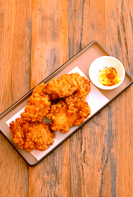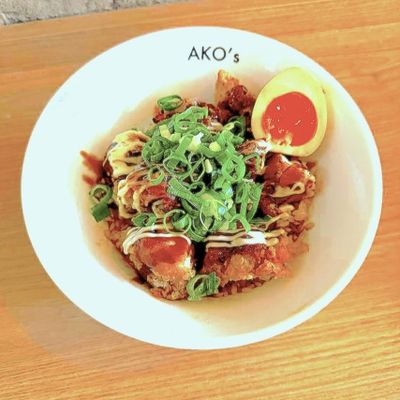 Crispy Japanese Chicken Karaage, Amadare Sweet Sauce, Japanese Mayo, Spring Onion, Marinated 1/2 cut egg on Japanese white rice